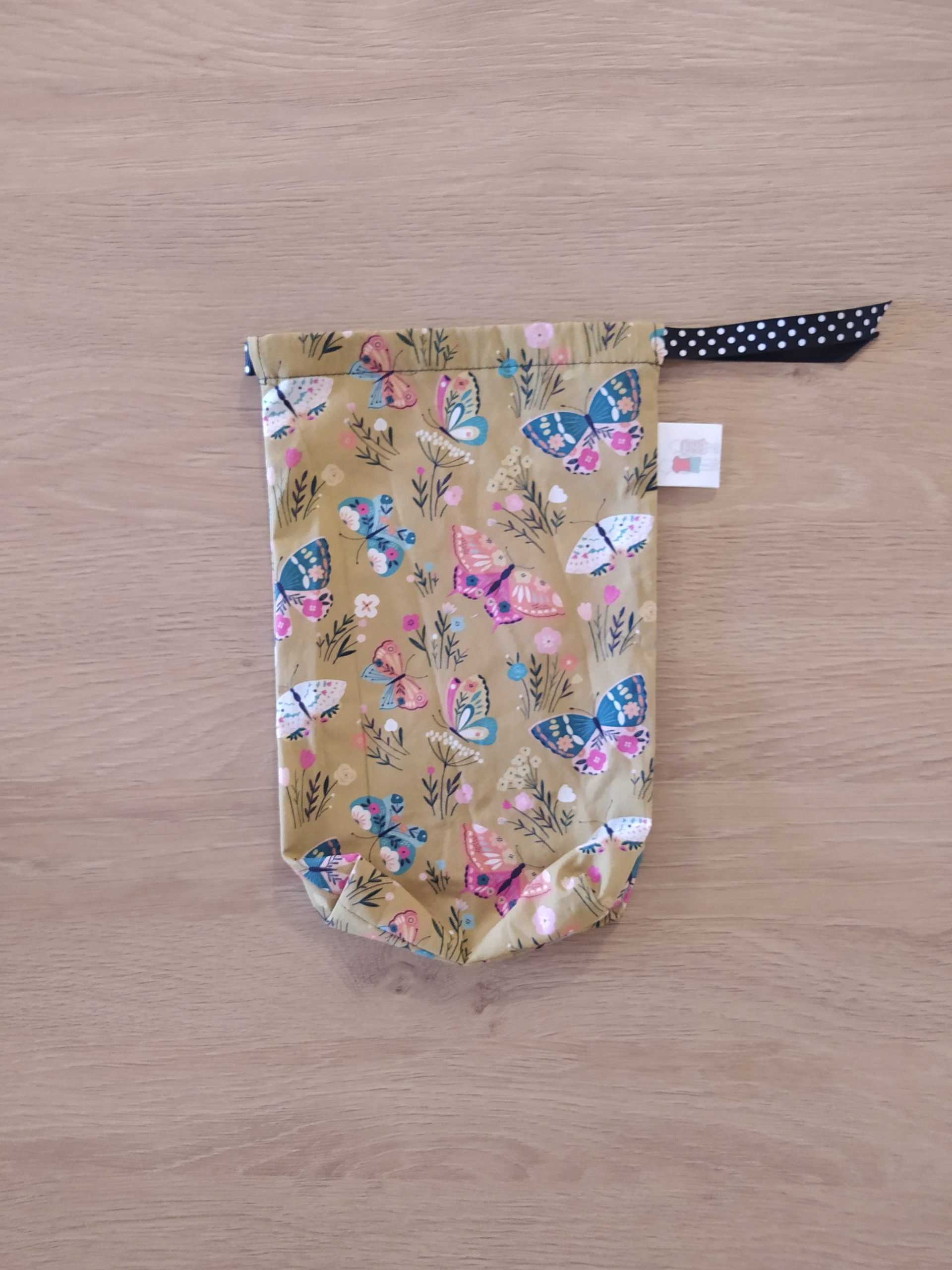 Pochette cadeau en coton imprimé bio avec un lien en ruban de satin, pour emballer et offrir vos cadeaux en mode zéro déchet.